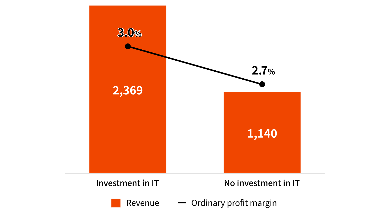 The use of Information technology (IT), or digital transformation (DX), is effective for improving labor productivity as research shows that SMEs that actively invest in IT enjoy higher revenue and ordinary profit margins compared to those that do not*4. However, over 92% of SMEs*5 are not using IT due to reasons such as a shortage of IT personnel and budget constraints.