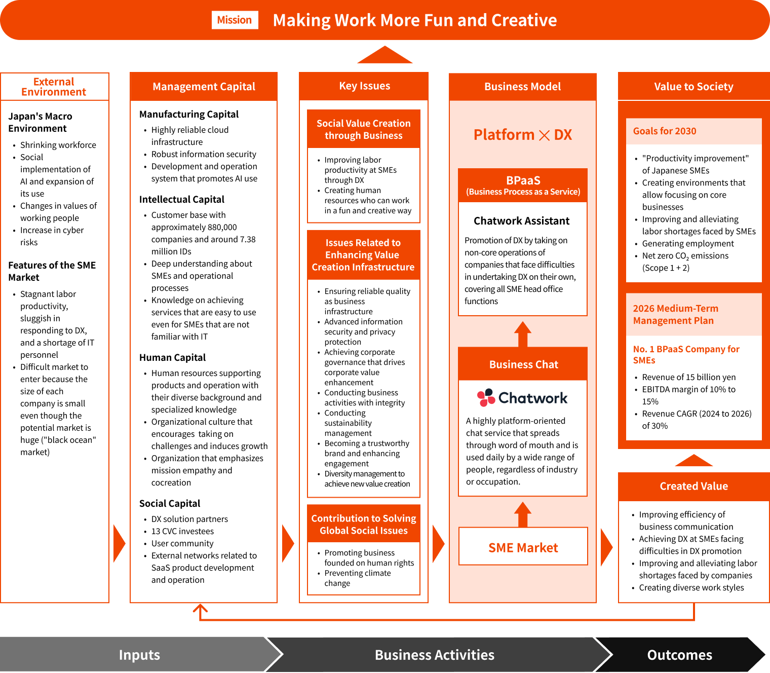 With people who empathize with our mission and a business platform based on Chatwork, which has an impressive number of customer touch points with SMEs, we can widely offer the rewards of IT adoption and DX to SMEs facing issues with labor shortages. This allows us to achieve long-term corporate value enhancement for our Group by contributing toward improving productivity at an overwhelming number of Japanese SMEs.